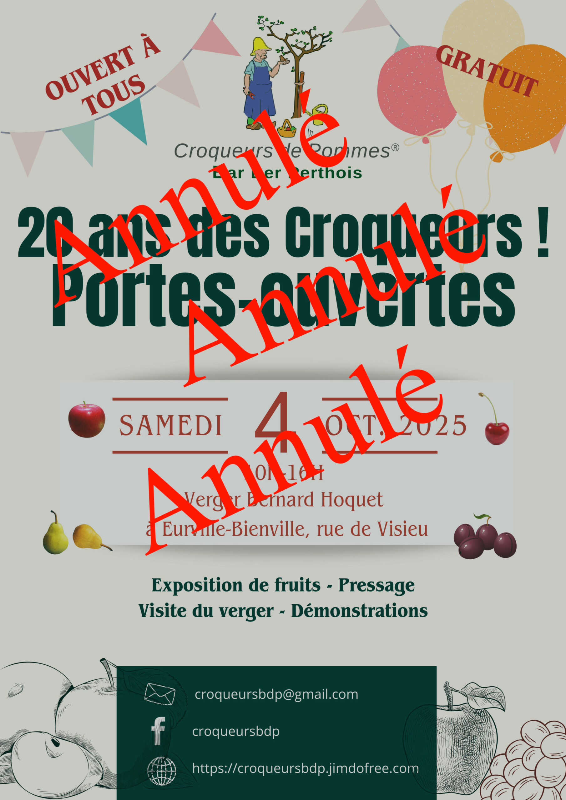 Pour fêter les 20 ans de l’association des Croqueurs de Pommes Bar Der et Perthois, les Croqueurs organisent une journée Portes Ouvertes au verger Bernard Hocquet à Eurville-Bienville (sortie du village direction Narcy) de 10h à 16h.